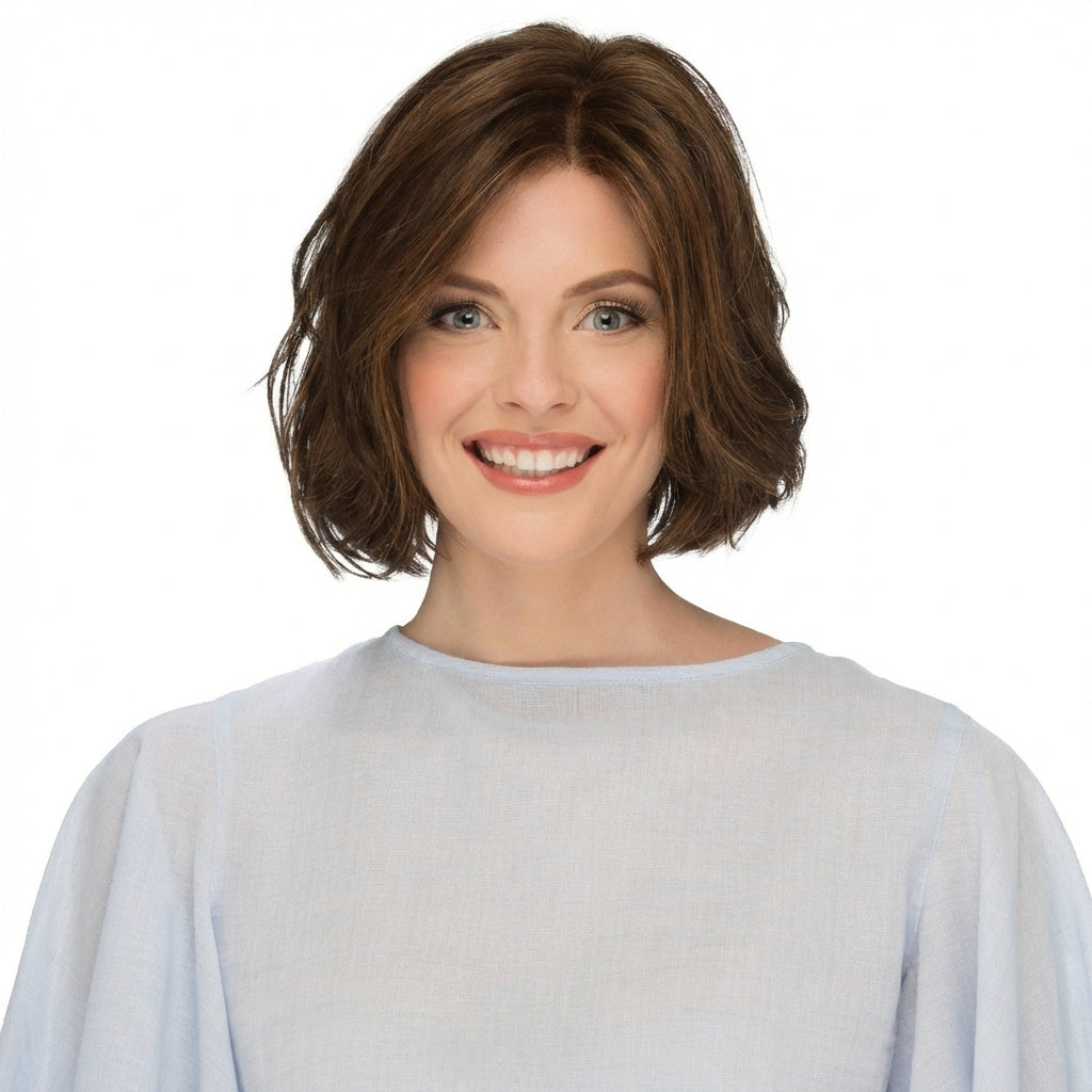 Enhance your style with Sage, an effortlessly elegant bob featuring the perfect amount of subtle waves. This simple yet sophisticated wig offers delicate texture that creates a natural look and movement. The lace part cap design provides a realistic scalp appearance, allowing for versatile styling and a seamless blend with your hairline.