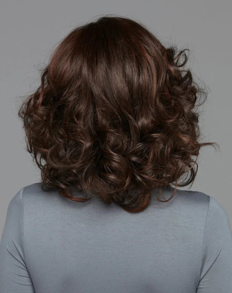 Shoulder-length soft curls with loads of volume, a smooth wave top, and a hand-knotted deep lace front that can be brushed back off the face or parted for an undetectable hairline.
