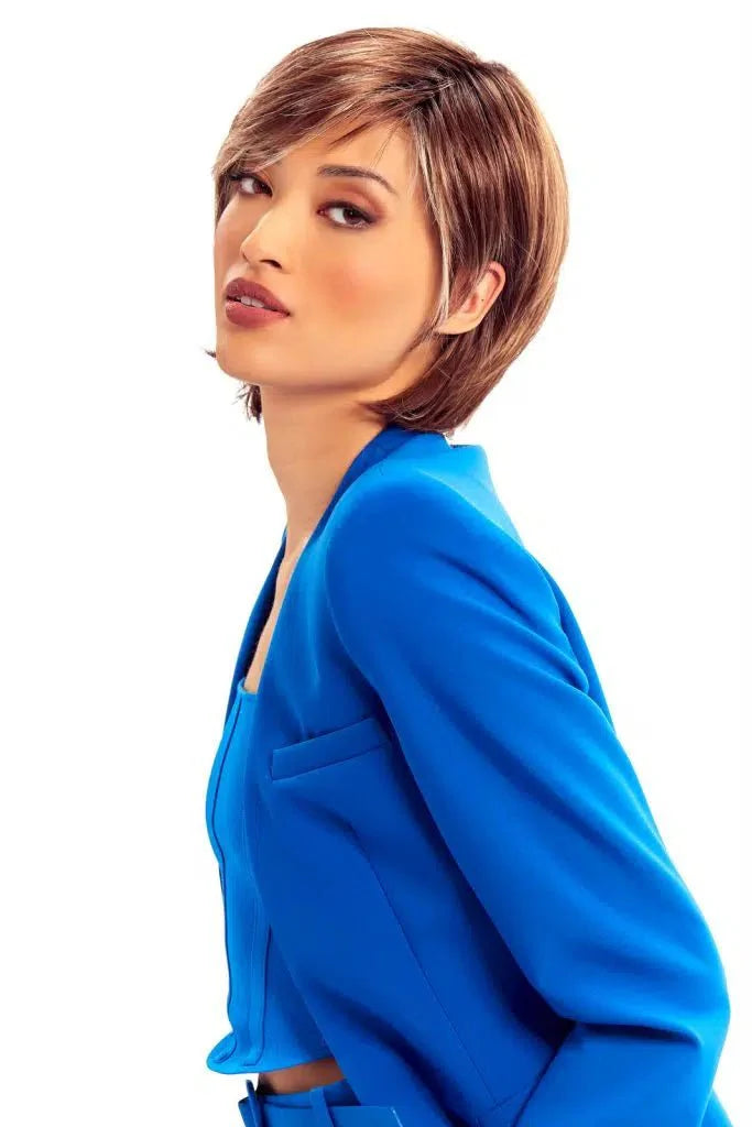 Shay is a low-density stylish pixie cut shag with a hand-knotted mono top and an extended lace front. The wispy bangs and the extended nape add enough length on the sides to frame the face, and the ability to tuck behind your ears. The hand-knotted undetectable mono top and ear-to-ear lace front let you part the hair in any direction, giving you the option to pull it back off your face.